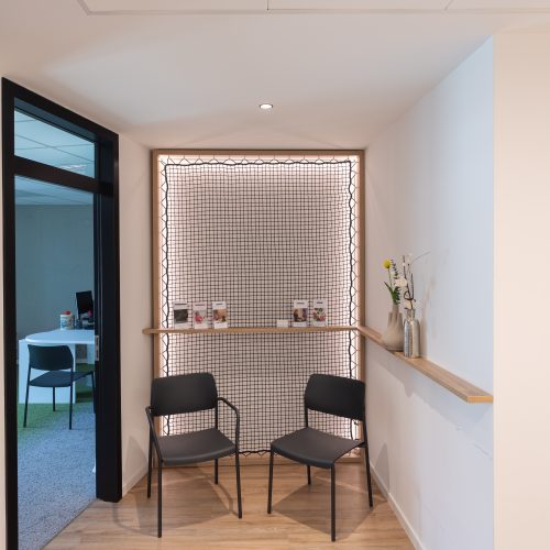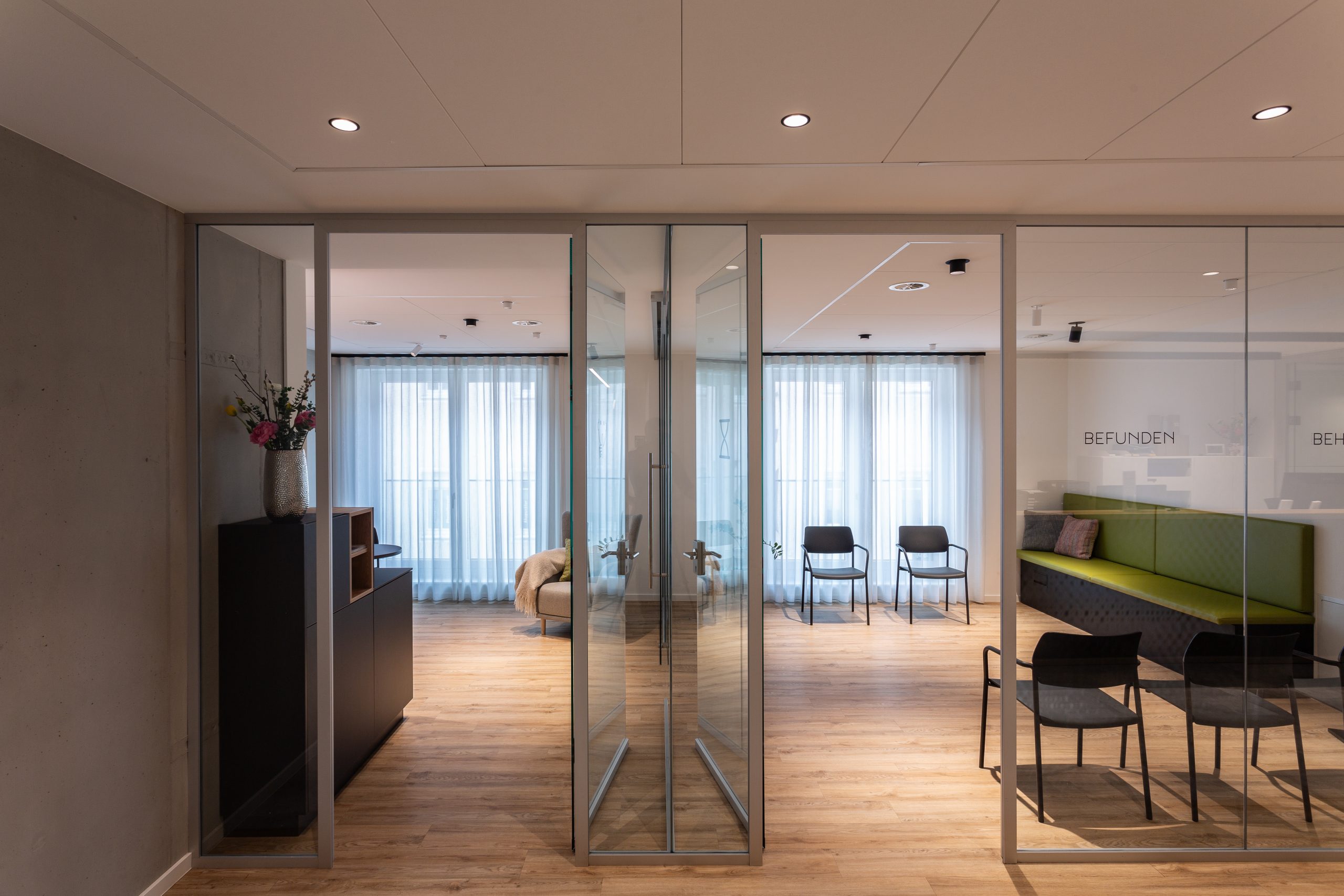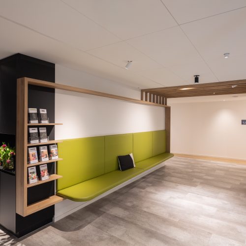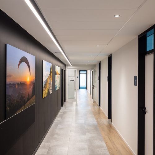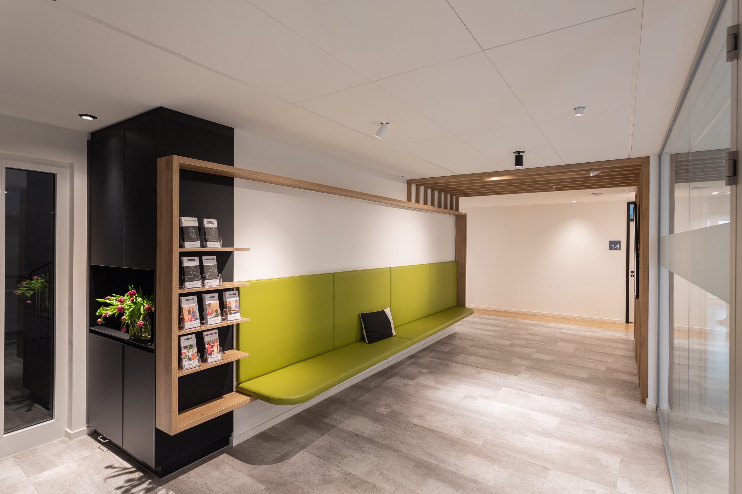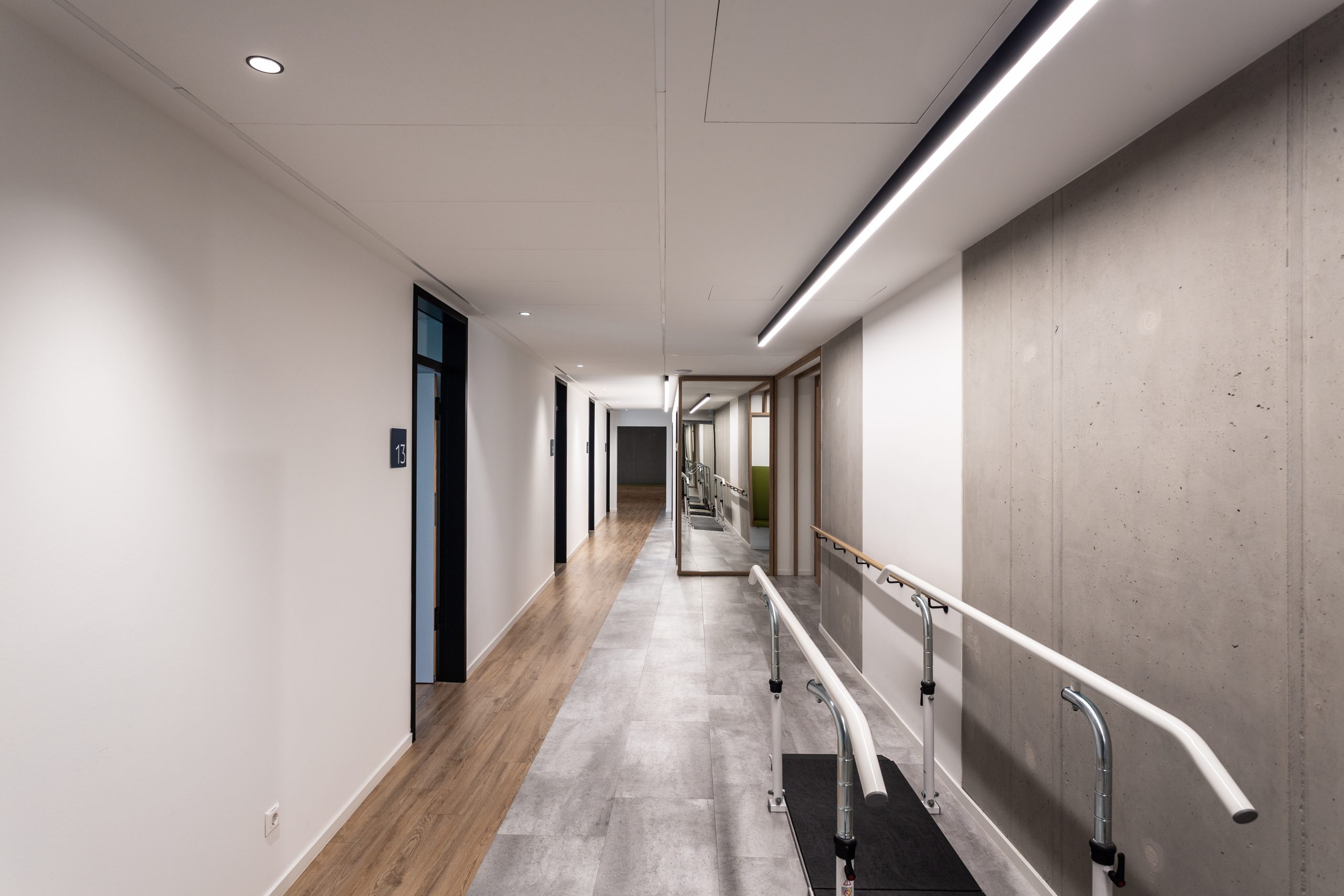 Die Herausforderung bei diesem Projekt war, das vielfältige Angebotsspektrum auf zwei Etagen und in zwei Gebäuden unterzubringen- einem langestreckten Neubau und eine denkmalgeschützte Fläche eines ehemaligen Gasthauses von 1705. Die Materialien und Oberflächen sollten dabei alle Nutzungen miteinander optisch verbinden. Die bis zu 50m langen Flure sollten nicht langweilig wirken-durch schräg verlegte Bodenbeläge, wechslende Wandoberflächen und abwechslungsreiche Leuchten wurde dies realisiert. Struktur geben Akzente in schwarz und den drei Hausfarben des CI.