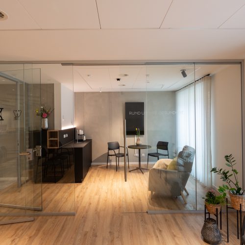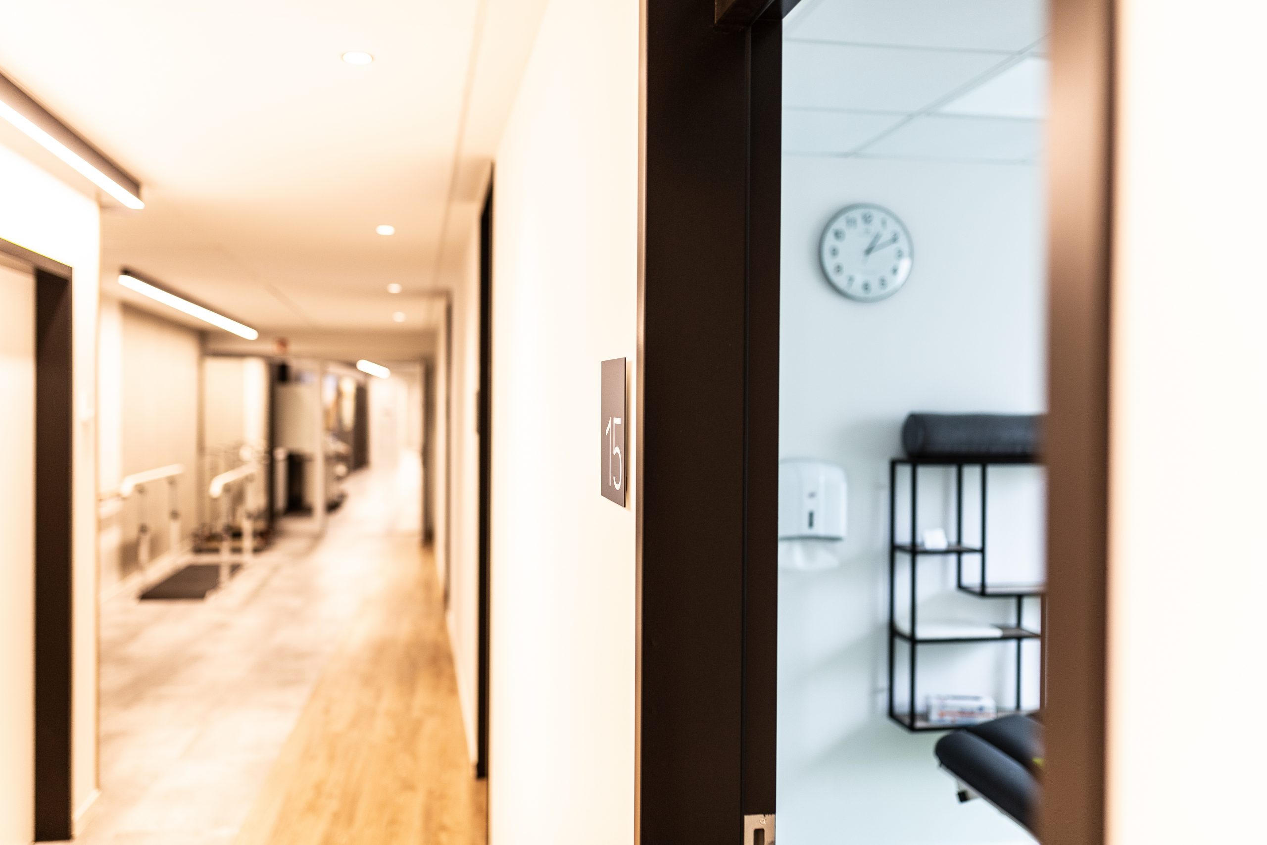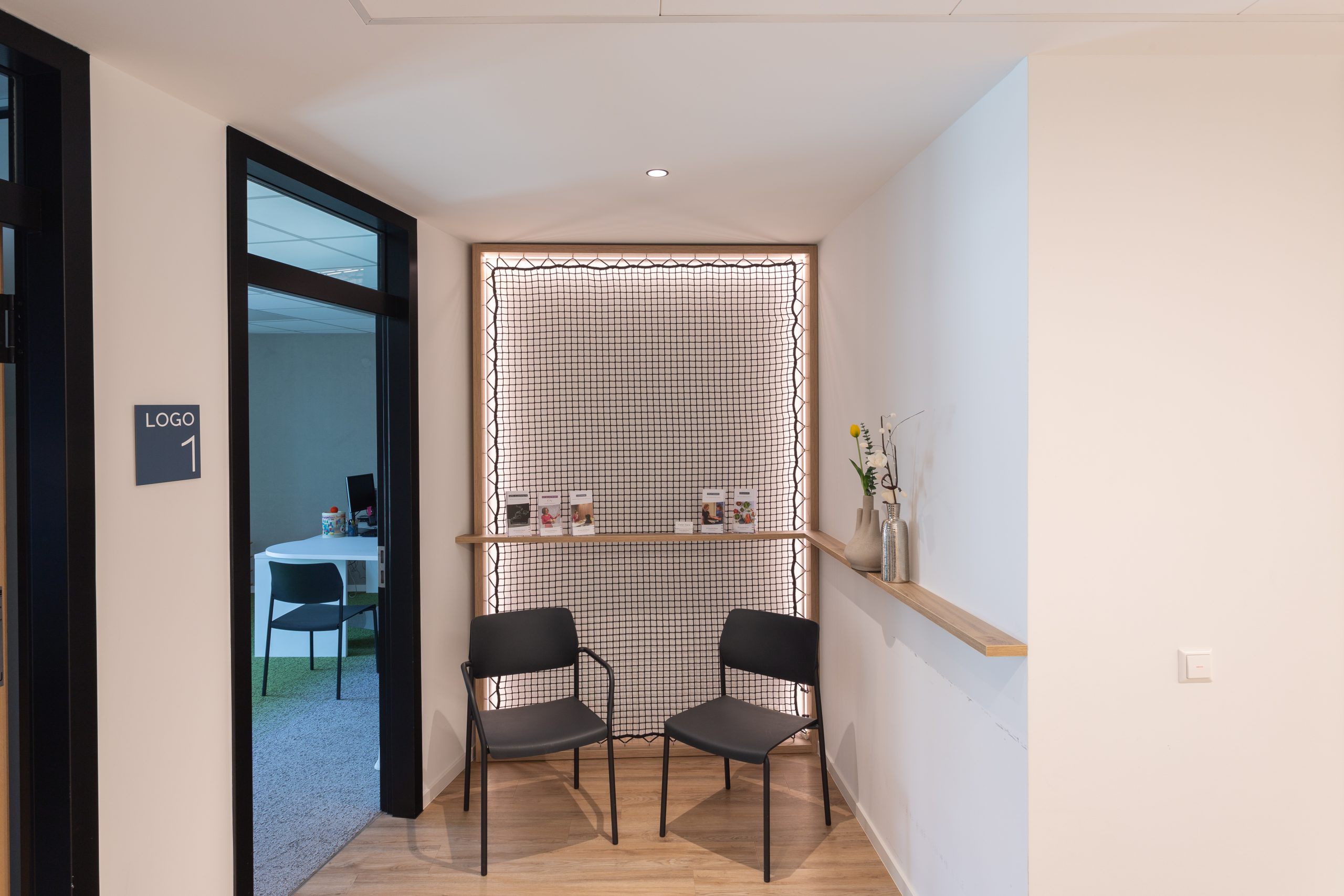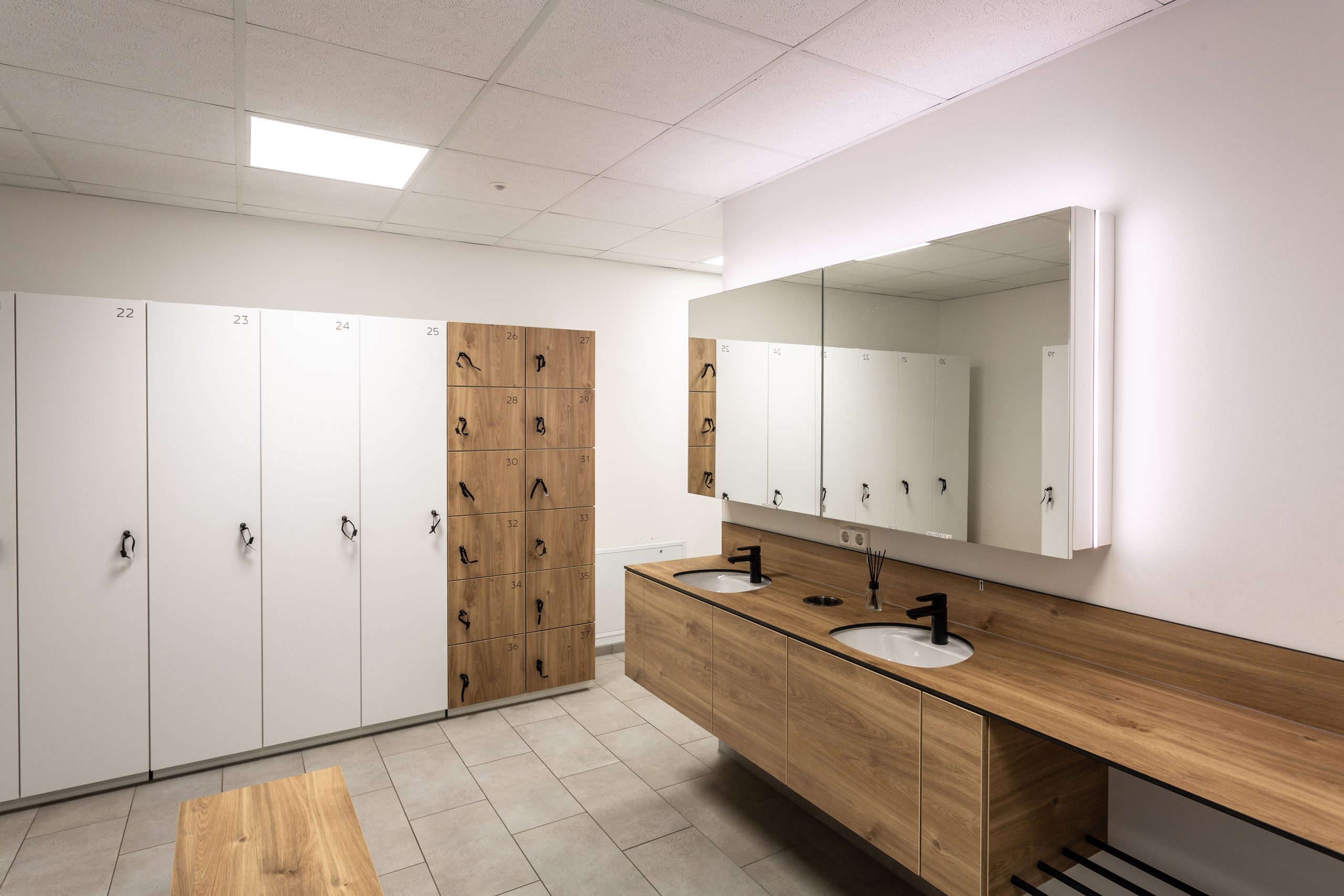 Die Herausforderung bei diesem Projekt war, das vielfältige Angebotsspektrum auf zwei Etagen und in zwei Gebäuden unterzubringen- einem langestreckten Neubau und eine denkmalgeschützte Fläche eines ehemaligen Gasthauses von 1705. Die Materialien und Oberflächen sollten dabei alle Nutzungen miteinander optisch verbinden. Die bis zu 50m langen Flure sollten nicht langweilig wirken-durch schräg verlegte Bodenbeläge, wechslende Wandoberflächen und abwechslungsreiche Leuchten wurde dies realisiert. Struktur geben Akzente in schwarz und den drei Hausfarben des CI.