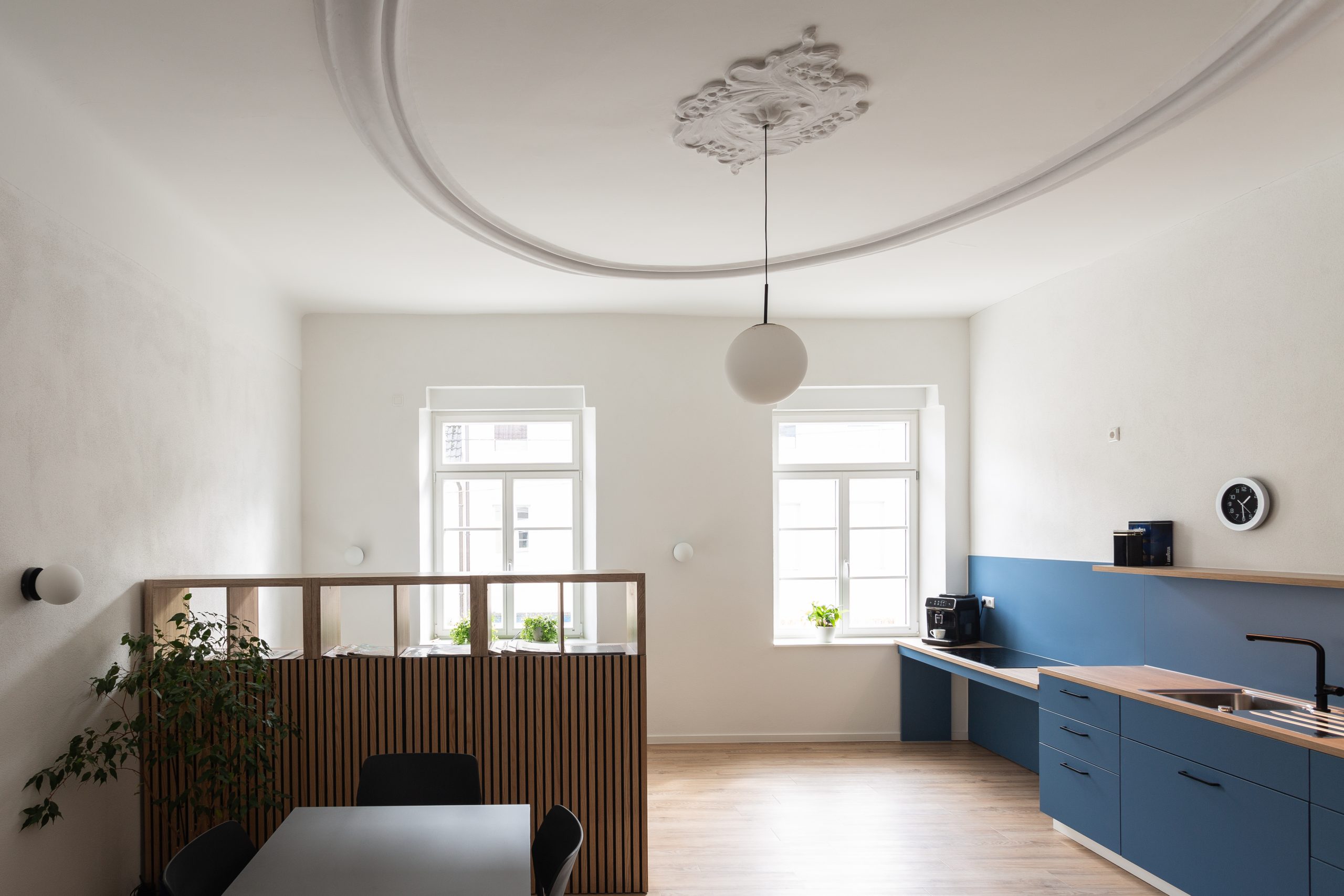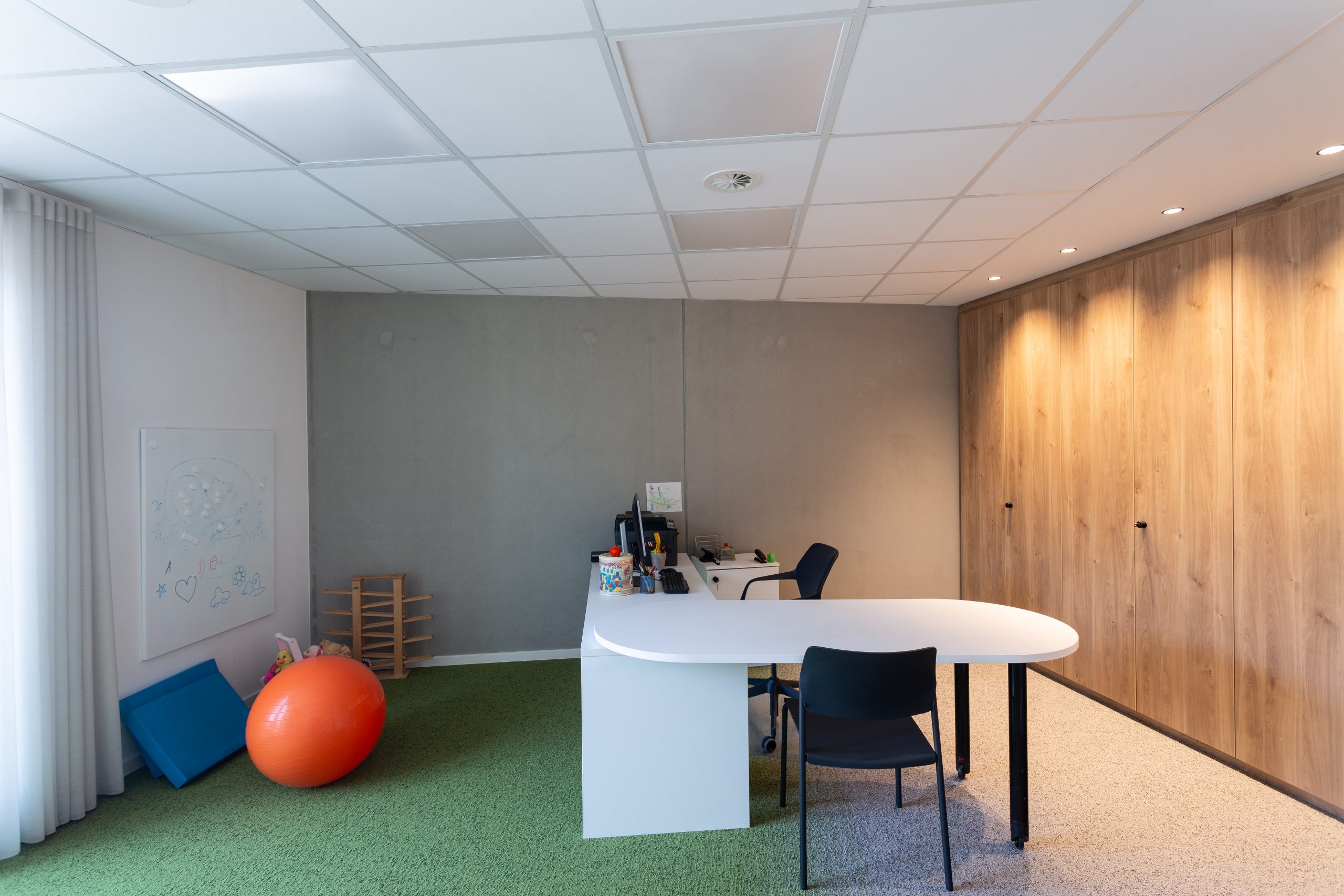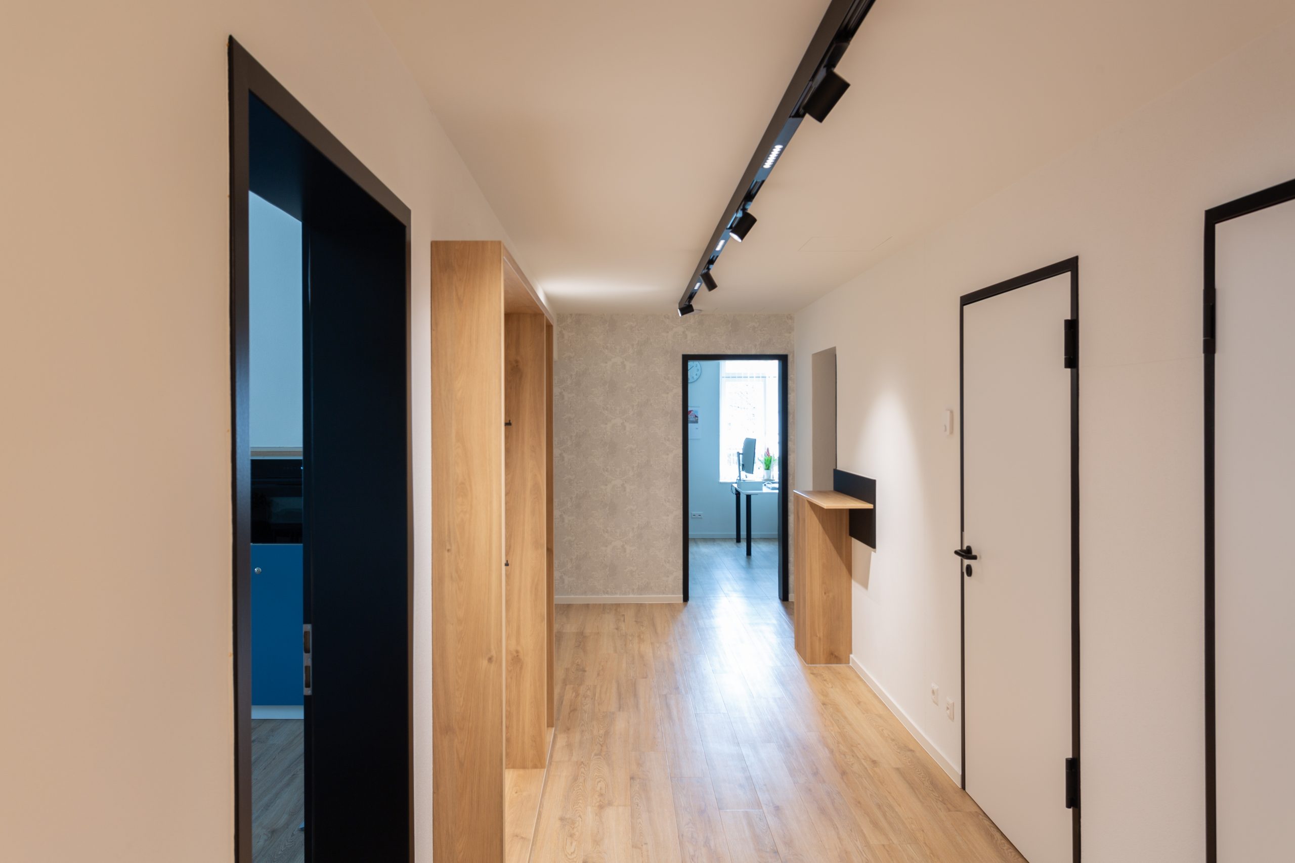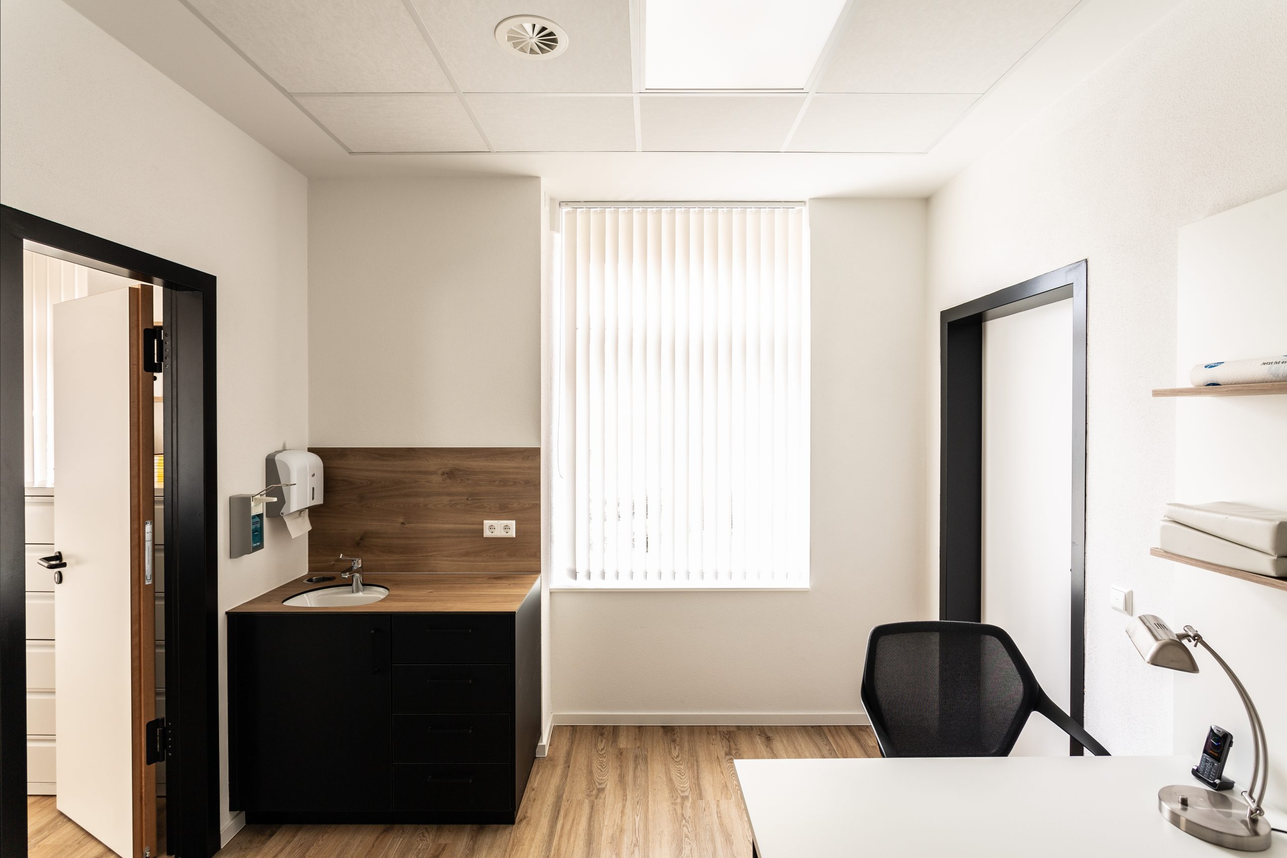 Die Herausforderung bei diesem Projekt war, das vielfältige Angebotsspektrum auf zwei Etagen und in zwei Gebäuden unterzubringen- einem langestreckten Neubau und eine denkmalgeschützte Fläche eines ehemaligen Gasthauses von 1705. Die Materialien und Oberflächen sollten dabei alle Nutzungen miteinander optisch verbinden. Die bis zu 50m langen Flure sollten nicht langweilig wirken-durch schräg verlegte Bodenbeläge, wechslende Wandoberflächen und abwechslungsreiche Leuchten wurde dies realisiert. Struktur geben Akzente in schwarz und den drei Hausfarben des CI.